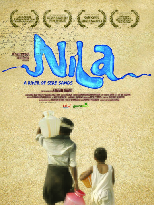 The film is a page of the current state of Kerala’s (a Southern Indian State) second largest river Nila (a.k.a. Bharathapuzha). The river has dried up due to excessive human activities, major one being incessant sand mining for more than thirty years. It shows how people along the river bank lose their way of living and resort to gambling (playing cards for money is illegal in India) to kill time. Rajan is a Jobless man, his mentally challenged mother in law and wife; she is a lone lady fighting a long legal battle against powerful sand miners in-spite of strong opposition and struggle to meet even advocate’s fees. The utmost shortage of water and dependency on infrequent supply of water through government public distribution system is depicted. 90% of the frames were shot in the middle of the dried river bed. Hence the audience will get a feel that even the river bed with its sere sands is one of the main characters that tells a melancholic tale of its own, through the sounds arising from the dusty winds and tread of humans on its bosom!
