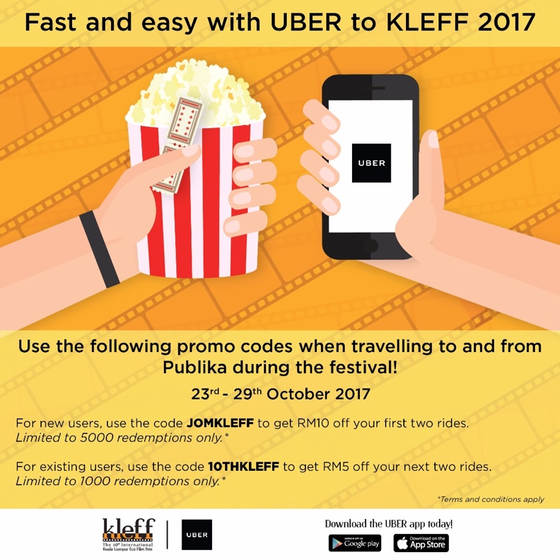 In partnership with UBER, we’re excited to share with all festival go-ers the KLEFF’s Uber promo code** in which visitors can use to attend the 10th International Kuala Lumpur Eco Film Fest 2017 (KLEFF2017) happening on the 23rd – 29th October in Publika!